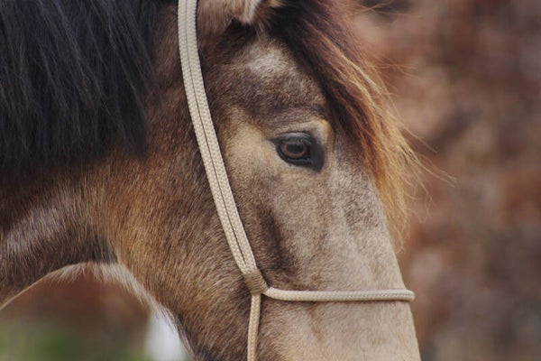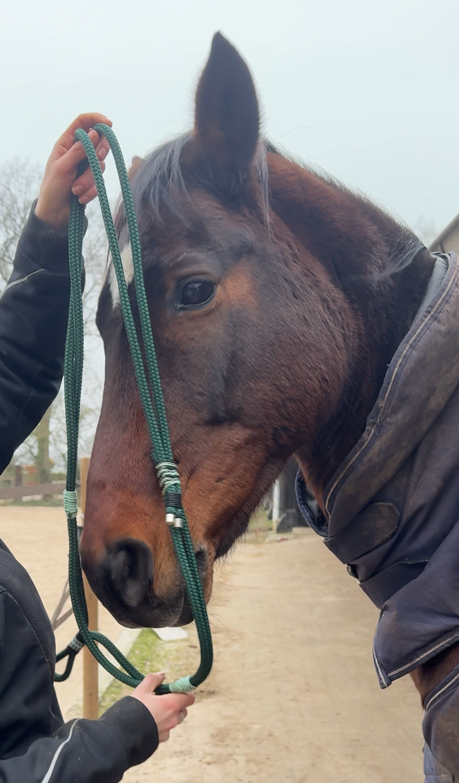 het touw is 10 mm dik en heeft dus geen scherpe inwerking. Hoe dunner een touw hoe scherper die inwerkt, daarom heb je bij een Touwhalster 2 touwen over de neus zodat die minder scherp inwerkt. Dit halster heeft al een dikker touw dus hier is het niet nodig.